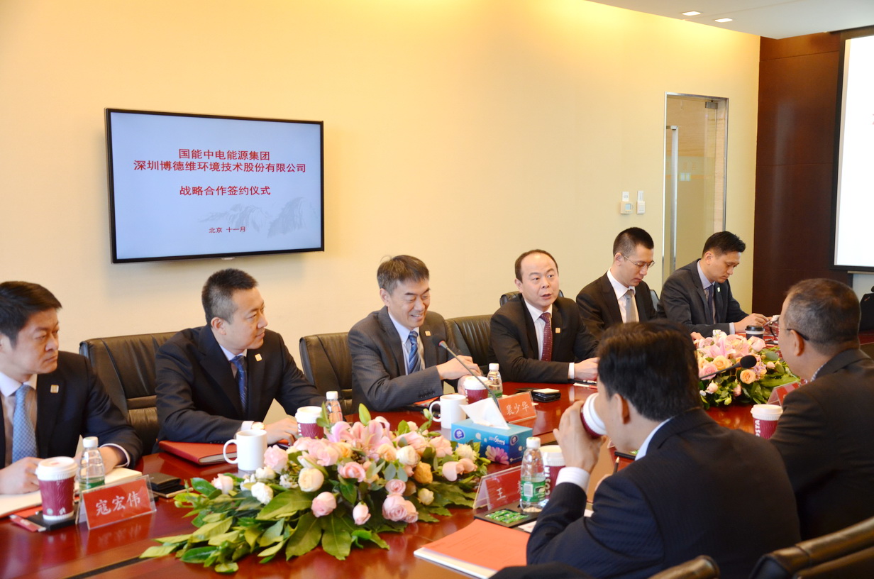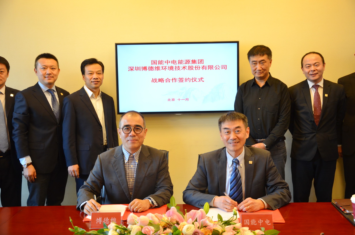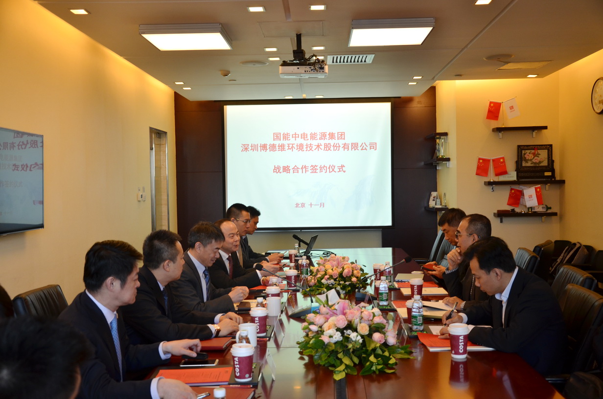 2017年11月8日上午,國能中電能源集團(tuán)有限責(zé)任公司與深圳博德維環(huán)境技術(shù)股份有限公司達(dá)成戰(zhàn)略合作協(xié)議,并在國能中電集團(tuán)總部舉行了簽約儀式。博德維總裁蕭龍、技術(shù)副總裁王秦、北京公司總經(jīng)理崔艷軍,國能中電集團(tuán)副董事長裴少華,國能中電集團(tuán)董事、北京國能中電節(jié)能環(huán)保技術(shù)股份有限公司總裁初煒,國能中電集團(tuán)副總裁、國峰清源生物能源有限責(zé)任公司總經(jīng)理?xiàng)铎o、北京國能中電節(jié)能環(huán)保技術(shù)股份有限公司副總裁寇宏偉,國能中電(北京)投資有限責(zé)任公司總經(jīng)理王邁,國能中電能源集團(tuán)廣東分公司常務(wù)副總經(jīng)理張翼,北京國能中電節(jié)能環(huán)保技術(shù)股份有限公司設(shè)計(jì)院副院長黃準(zhǔn)等領(lǐng)導(dǎo)出席了簽約儀式。